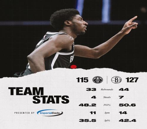 小邁克爾-波特是今夏掘金用1首輪送到籃網換走的卡約,此役小波特也算是手刃舊主了,他帶領孱弱的籃網擊敗了掘金,小波特來到籃網后終于開始打出全明星的水準,半場16分,全場比賽32分鐘,17中8,三分6中2,罰球9中9,拿到27分11籃板5助攻1蓋帽,命中率47.1%。