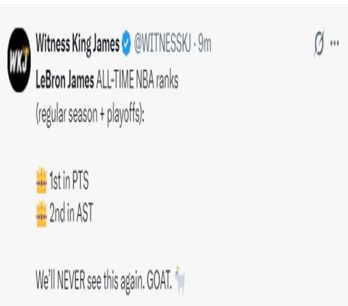 湖媒WKJ:詹姆斯在NBA歷史(常規(guī)賽+季后賽),總得分歷史第一,總助攻歷史第二,我們以后再也看不到這樣的球員了,GOAT。