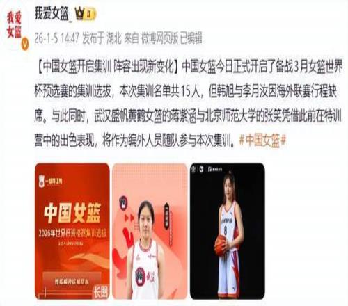 按照中國籃球之隊此前發(fā)布的消息, 中國女籃于1月5日正式開啟集訓了,本次集訓名單是15人,不過,韓旭和李月汝都在海外聯(lián)賽,將缺席這一次的集訓。