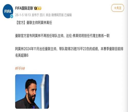 曼聯官方:阿莫林不再擔任球隊主帥,達倫弗萊徹將擔任代理主教練 極目新聞 2026-01-05 19:15:01 1月5日,據@FIFA國際足聯 :曼聯主帥阿莫林離任。阿莫林于2024年11月出任曼聯主帥,帶隊取得25勝15平23負的成績,本賽季曼聯目前排名英超第6。據統計,阿莫林帶隊一年勝率不足40%。(來源:@FIFA國際足聯)英超免費觀看_阿莫林免費觀看_曼聯官方免費觀看_英超高清在線_阿莫林高清在線_曼聯官方高清在線 英超 阿莫林 曼聯官方 英超聯賽 達倫·弗萊徹 曼徹斯特聯足球俱樂部 上一篇: 阿莫林執教曼聯戰績:63場25勝15平23負,無緣歐聯杯冠軍 下一篇: 曼聯:阿莫林不再擔任主帥,弗萊徹將帶隊指揮