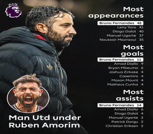 北京時間1月5日,曼聯官方宣布解雇球隊主帥阿莫林,根據英超官方的統計數據,B費是阿莫林治下曼聯在英超當中出場、進球和助攻最多的球員。
