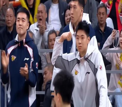 焦泊喬籃下暴扣后崔永熙在場邊亮肌肉慶祝。