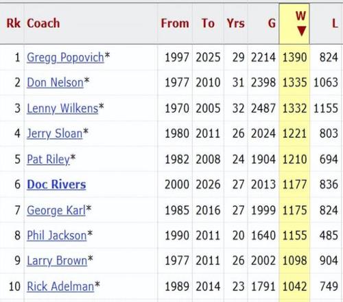 卡萊爾的生涯獲勝場數依然是999勝,連續12場敗北,讓他繼續無緣千勝里程碑。在NBA歷史上,目前一共有10位教練取得至少1000場勝利,排在首位的是波波維奇(1390勝),現役主教練中,只有雄鹿的老里弗斯在列,他獲得1177勝,在勝場排名中位列歷史第6。