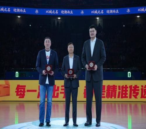 在備受矚目的致敬環節,俱樂部為李秋平、姚明、劉煒、章文琪四位上海籃球功勛人物精心準備了功勛紀念章。上海市體育局局長徐彬、久事集團董事長過劍飛、上海市籃協會長龔德慶,分別為到場的李秋平、姚明、章文琪三位俱樂部功勛教練員、運動員頒發功勛紀念章。老隊長章文琪則手持一枚鐫刻著2001—2002賽季奪冠陣容全體成員簽名的紀念籃球,鄭重交到現任隊長王哲林手中。這不僅僅是一件穿越時空的信物,更是將“頑強拼搏、追求卓越”大鯊魚的精神密碼,傳遞到新一代運動員的手中。