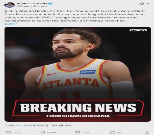 北京時間1月6日上午,NBA名記Shams報道,特雷-楊已經(jīng)提出交易申請,他和經(jīng)紀(jì)團(tuán)隊(duì)正與老鷹管理層商討交易事宜。Shams表示,自老鷹拒絕4年2.29億續(xù)約特雷-楊之后,他的經(jīng)紀(jì)團(tuán)隊(duì)一直跟管理層溝通,從上周開始討論交易。