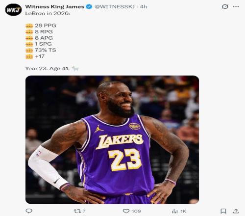 進入2026年后,詹姆斯兩場比賽場均29分8籃板8助攻1搶斷,真實命中率73%,正負值+17,這四項數據出爐后湖人媒體再度盛贊勒布朗就是GOAT。