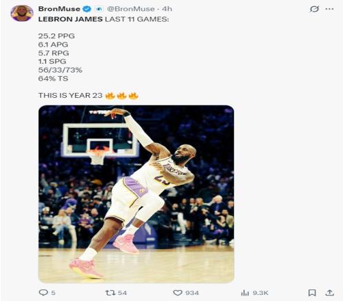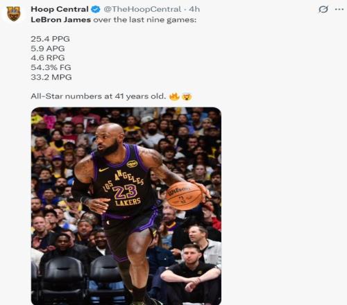 過去詹姆斯9場比賽,場均33.2分鐘,拿到25.4分5.9助攻4.6籃板,命中率54.3%,美媒認為41歲的他還是有全明星水準。