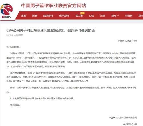 為嚴肅聯賽紀律,根據《中國男子籃球職業聯賽紀律準則》(簡稱《紀律準則》)第四章第四十九條之規定,對山東高速隊主教練邱彪處以停賽2場、罰款人民幣5萬元的處罰,停賽場次為2026年1月6日第十一輪場序105、1月9日第十二輪場序119的比賽。根據《紀律準則》第二章第二十四條之規定,對山東高速隊翻譯薛飛處以罰款人民幣2萬元的處罰。