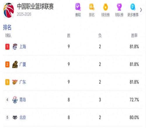 首先我們可以關注到目前排在前五名的分別是上海、廣廈、廣東、青島以及北京隊。這樣的一個排名和賽季初的排名應該是差距非常大的。因為我們知道一開始的時候,北京男籃是長期占據榜首,而廣東男籃則是排在前兩名,有的時候也能夠擠掉北京隊排在榜首。但經過了目前差不多十場比賽的爭奪之后,現在整個競爭格局發生了非常大的變化。