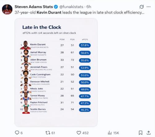 除此之外37歲的老杜皇末節(jié)命中率57.8%也是聯(lián)盟第一,賈馬爾-穆雷、杰倫-布倫森排在第二與第三,前十里只有杜蘭特一人在32歲以上。