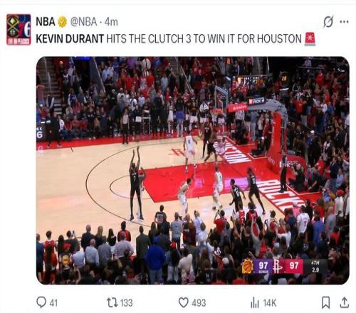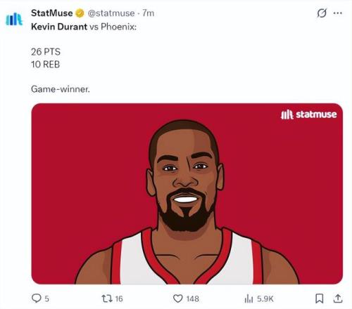 NBA官方也曬出了杜蘭特迎著防守干拔的準(zhǔn)絕殺三分球,全場(chǎng)球迷高呼MVP。