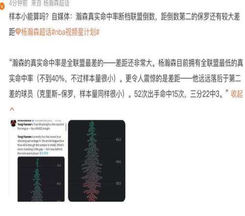除此之外,他和倒數第二的老將保羅差距也是非常大,也意味著楊瀚森的數據表現非常難看。事情的真相到底是怎么樣的,這位媒體在統計方面是不是存在著什么問題呢?