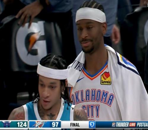 此后鮑爾繼續強投三分,亞歷山大艱難造犯規,克尼佩爾外線是真準,又輕松造成多特對他的三分犯規。雙方維持20分左右陷入拉鋸戰,后半段塞克斯頓造犯規+米勒繼續三分轟炸,三節打完時,黃蜂99-71領先雷霆28分!第四節儼然失去懸念,又到了亞歷山大打卡時間,只不過這一次和之前不一樣:被對手打花。雷霆全隊都毫無斗志,或許還沒從上一場被太陽絕殺的陰影走出來,又收獲一場慘敗!最終黃蜂124-97爆冷大勝雷霆!