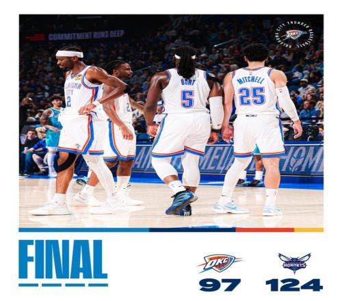末節決戰,迪亞巴特在禁區得手,黃蜂將分差擴大至30分。雷霆遠投手感依舊不理想,只能依靠著零星單打追分,分差始終在20分左右。OKC追分乏力,夏洛特則始終占據著場上主動權。距離終場還剩3分22秒,黃蜂領先27分鎖定大局。