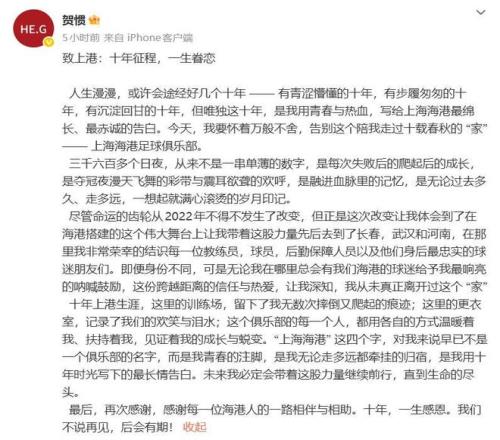 同城球隊上海海港則再次面臨球員離隊,現年32歲的老將賀慣在個人社交賬號上發文告別球隊。賀慣自2013年加盟上港,總計代表上港出場209場,攻進7球并送出4次助攻。但這幾個賽季,賀慣不斷被租借到其他中超球隊。