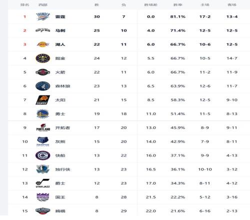 今日比賽后快船、獨行俠排名互換,其他西部球隊排名不變。