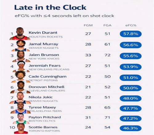 本賽季至今,在進攻時間最后4秒以內(nèi)的有效投籃命中率方面,37歲的杜蘭特依舊笑傲整個NBA,命中率高達57.8%。