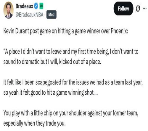 對于杜蘭特來說,用一記三分絕殺手刃舊主,也讓他一掃憋在胸中已久的悶氣,賽后一番話扎心老東家太陽。