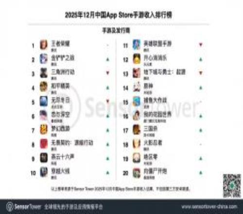騰訊衛冕2025年12月全球手游發行商收入冠軍,旗下《王者榮耀》、《金鏟鏟之戰》、《三角洲行動》與《和平精英》包攬本期中國App Store手游收入榜TOP4。數據顯示,《王者榮耀》2025年全年收入(不含中國地區第三方安卓渠道)超過20億美元。
