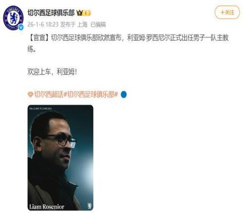 1月6日,據足球報:英超切爾西足球俱樂部官方消息,英格蘭少帥羅西尼爾成為切爾西新帥。