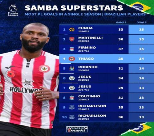 北京時間1月6日,德轉列出了巴西球員英超歷史單賽季射手榜,布倫特福德的前鋒伊戈爾-蒂亞戈在上周末英超第20輪比賽上演帽子戲法之后,如今距離紀錄只有1球的差距,這也意味著他很有希望創造巴西球員在英超單賽季進球數的新紀錄。