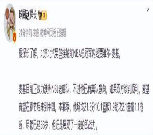 2023年被NBA裁掉之后,麥基加盟波多黎各聯賽巴亞蒙流浪者,并且幫助球隊奪得24-25賽季波多黎各聯賽冠軍。本賽季,麥基加盟澳洲NBL老鷹隊,首秀便砍下32分13籃板2助攻的全面數據,20中15的進攻效率也是非常恐怖。本賽季至今,麥基場均可以貢獻21.3分10.1籃板1.9助攻2.1蓋帽1.1搶斷,但是,麥基已經有了離隊的意向,如果北京首鋼與麥基談判順利,麥基有望在春節后來到中國。