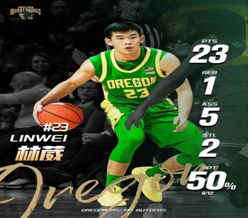1月6日NCAA常規(guī)賽一場比賽,俄勒岡大學(xué)在客場加時以85-88惜敗羅格斯大學(xué),效力俄勒岡大學(xué)的后衛(wèi)林葳首發(fā)出戰(zhàn),打出了來到NCAA賽場之后的最佳一戰(zhàn),全場出戰(zhàn)33分鐘,14投8中,三分12中6、罰球2中1,砍下23分1籃板5助攻2搶斷,其中得分、出場時間、三分球等多項數(shù)據(jù)創(chuàng)個人NCAA生涯新高。
