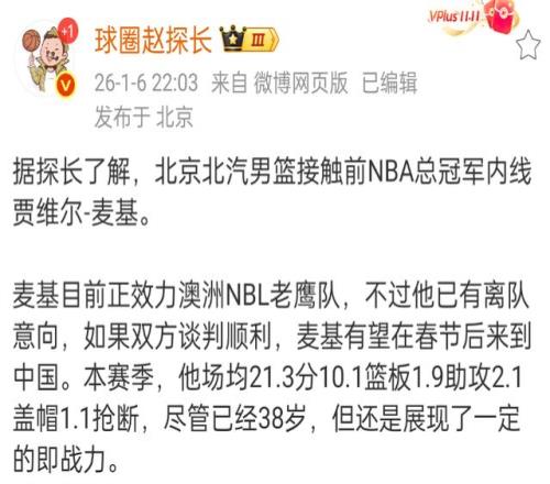 北京首鋼在這樣的前提下,開始接觸麥基,由于NBL賽季結(jié)束的很早,所以麥基也有離隊的想法,畢竟兩份合同影響不大。