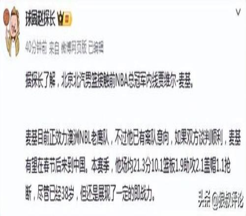根據(jù)媒體人“趙探長”的報(bào)道,北京北汽男籃接觸前NBA總冠軍內(nèi)線賈維爾-麥基。