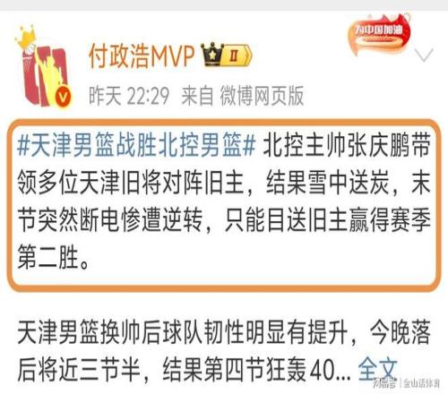 北控輸天津賽后,著名媒體人付政浩在社媒上點(diǎn)評了本場比賽。“北控主帥張慶鵬帶領(lǐng)多位天津舊將對陣舊主,結(jié)果雪中送炭,末節(jié)突然斷電慘遭逆轉(zhuǎn),只能目送舊主贏得賽季第二勝。”;“天津男籃換帥后,球隊(duì)韌性明顯有提升,今晚落后將近三節(jié)半,結(jié)果第四節(jié)狂轟40分,生生逆轉(zhuǎn)北控……相比之下,北控末節(jié)明顯有些慌亂無措。”。