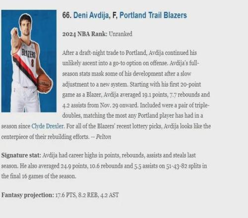 自打被交易至波特蘭隊后,阿夫迪亞的逆襲之路仍在繼續,他逐漸成長為球隊進攻端可以信賴的核心,在上賽季的整體數據表像之下,大家忽視了他在開拓者初期的適應戰術體系的掙扎與后期的蛻變,自2024年11月29日他代表開拓者隊砍下生涯首次20+得分后,其場均貢獻19.1 分、7.7 籃板、4.2 助攻,期間還收獲兩次三雙,這一成績追平了自德雷克斯勒時代以來開拓者隊球員單季最高三雙紀錄,在球隊近些年選擇的一眾樂透秀里,阿夫迪亞儼然已成為波特蘭隊重建計劃的核心支柱。