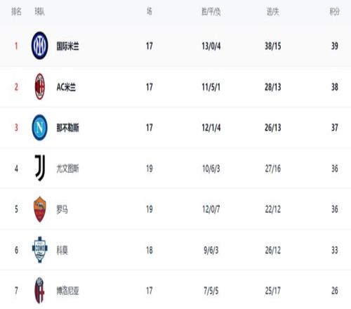 在積分榜上,國際米蘭以39分繼續領跑。AC米蘭緊隨其后,拿到38分。那不勒斯以37分排第3。尤文圖斯和羅馬都是36分,排名第4和第5名。爭冠格局白熱化,前5的球隊最多只差3分。不過,尤文圖斯和羅馬踢的場次比較多,比前3的球隊多踢了2場,他們要想沖擊冠軍還是比較困難。科莫這匹黑馬在法布雷加斯的率領下戰績出色,總積分達到33分,排名第6。