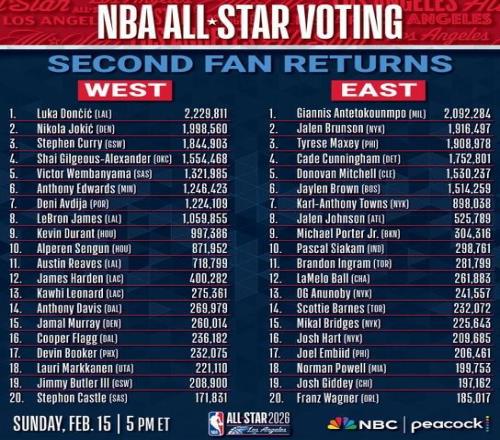 北京時間今日,NBA官方公布了最新一期的全明星投票結果,東契奇以2229811票仍為票王,字母哥以2092284票保持東部第一,詹姆斯則從西部第九位升至西部第八位。