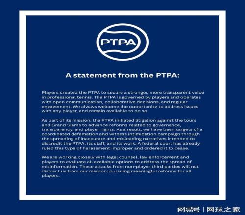 聲明中寫道:“作為使命的一部分,PTPA對巡回賽組織和大滿貫賽事提起訴訟,以推動與治理、透明度和球員權益相關的改革。正因如此,我們成為了一場有組織的誹謗和證人恐嚇行動的目標,通過傳播不準確、具有誤導性的敘事,意在抹黑PTPA、其員工以及我們的工作。”