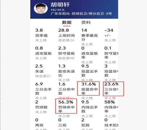 現(xiàn)在網(wǎng)絡(luò)上流傳一句話:廣東隊(duì)也有一個“高鐵”,甚至比山東高鐵還離譜。不說不知道,一查嚇一跳。經(jīng)過查看數(shù)據(jù),胡明軒本賽季真的是比山東高鐵還離譜。高詩巖的三項(xiàng)命中率是41%、37%、68%,而胡明軒是31%、23.6%、56.3%,投籃命中率、三分命中率和罰球命中率都比山東高鐵低。你難以想象,頂薪球員和隊(duì)長的罰命中率不到6成,三分命中率只是2成多。胡明軒本賽季真是中了邪了。