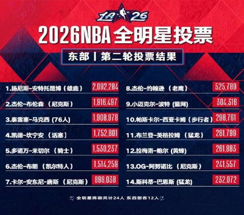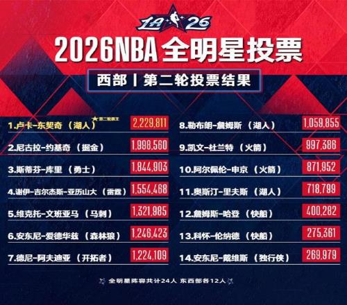 全明星球迷投票次輪:東契奇票王,字母哥東部第一,詹姆斯西部第八 上游新聞 2026-01-07 13:28:32 北京時間1月7日,NBA官方公布了2026年NBA全明星第二輪球迷投票結(jié)果,洛杉磯湖人后衛(wèi)盧卡·東契奇與密爾沃基雄鹿前鋒揚尼斯·安特托昆博,分別繼續(xù)領跑西部和東部。東契奇為第二輪票王,詹姆斯位居西部第八。2026年NBA全明星投票將于美國東部時間1月14日晚上11點59分截止。全明星首發(fā)陣容將于1月19日公布。 資料來源 @NBANBA免費觀看_阿德托昆博免費觀看_洛杉磯湖人免費觀看_NBA高清在線_阿德托昆博高清在線_洛杉磯湖人高清在線 NBA 阿德托昆博 洛杉磯湖人 勒布朗詹姆斯 盧卡·東契奇 全明星球迷投票 勒布朗·詹姆斯 揚尼斯·安戴托昆波 詹姆斯全明星球迷投票次輪西部第八 上一篇: 湖人逆轉(zhuǎn)!老詹30+8創(chuàng)紀錄,勇士棄將犯大錯,東契奇30+5末節(jié)立功 下一篇: 雷迪克終于看明白了!發(fā)布會大贊東詹擋拆,他倆配合接近無解!