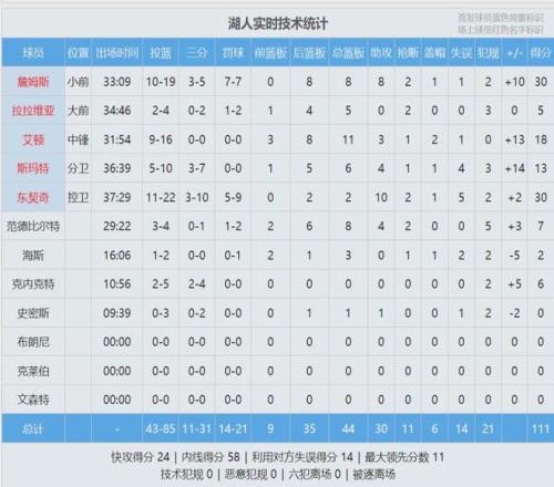此役過后,湖人重返西部第三,勝場數和第四的掘金一樣,領先第五的火箭0.5個勝場!最后看看數據,說說你的感受: