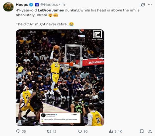 湖媒寫道:41歲的詹姆斯還能再扣籃時頭超高籃筐,這簡直太不可思議了,GOAT或許永遠不該退役。