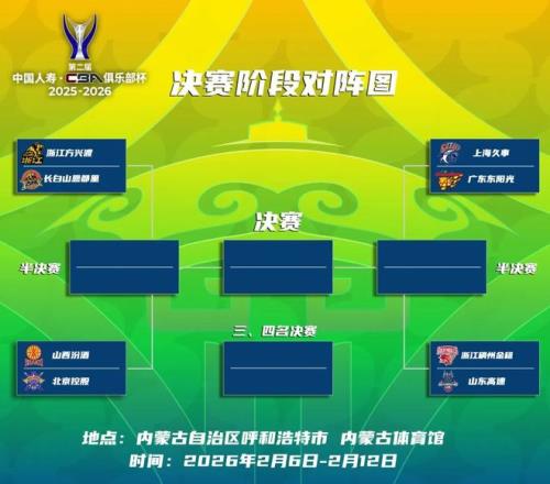 今天下午,CBA聯賽官方也發布了本屆CBA俱樂部杯決賽階段的競賽日程。上海久事男籃將在2月6日晚間對戰廣東東陽光男籃。