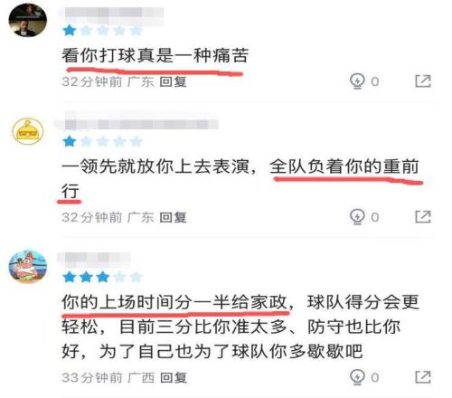 本輪廣東以5分優(yōu)勢(shì)擊敗深圳的比賽,胡明軒仍然沒(méi)有找回手感,且還在比賽中和深圳的馬明坤發(fā)生沖突。而這個(gè)小插曲,也沒(méi)能讓胡明軒調(diào)整好狀態(tài),反倒是越打越急。整場(chǎng)比賽打下來(lái),胡明軒在25分鐘的上場(chǎng)時(shí)間里,5投1中,三分球4中1,僅得到3分,-6的正負(fù)值為全隊(duì)最差,而他這3分,也是首發(fā)五虎中最低的那位。有球迷不禁感嘆道:“看你打球真是一種痛苦”、“全隊(duì)負(fù)著你的重前行”。