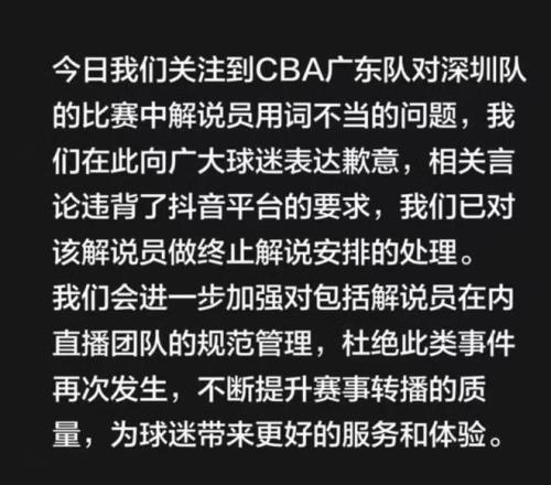 面對批評,抖音體育反應很快,不但公開作出了道歉,還對擔任本場的解說員作了處理,終止了他的解說資格。抖音體育表示,我們關注到CBA廣東隊對深圳隊的比賽中解說員用詞不當的問題,我們在此向廣大球迷表達歉意,相關言論違背了抖音平臺的要求,我們已對該解說員做終止解說安排的處理。我們會進一步加強對包括解說員在內直播團隊的規范管理,杜絕此類事件再次發生,不斷提升賽事轉播的質量,為球迷帶來更好的服務和體驗。