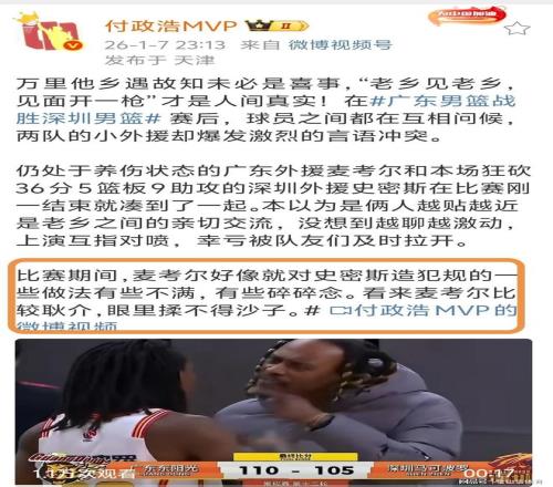 賽后,媒體人付政浩還原了事情真相。他在個人社媒透露,“萬里他鄉遇故知未必是喜事,‘老鄉見老鄉,見面開一槍’才是人間真實!在賽后,球員之間都在互相問候,兩隊的小外援卻爆發激烈的言語沖突。仍處于養傷狀態的廣東外援麥考爾和本場狂砍36分5籃板9助攻的深圳外援史密斯在比賽剛一結束就湊到了一起。本以為是倆人越貼越近是老鄉之間的親切交流,沒想到越聊越激動,上演互指對噴,幸虧被隊友們及時拉開。比賽期間,麥考爾好像就對史密斯造犯規的一些做法有些不滿,有些碎碎念。看來麥考爾比較耿介,眼里揉不得沙子。”。