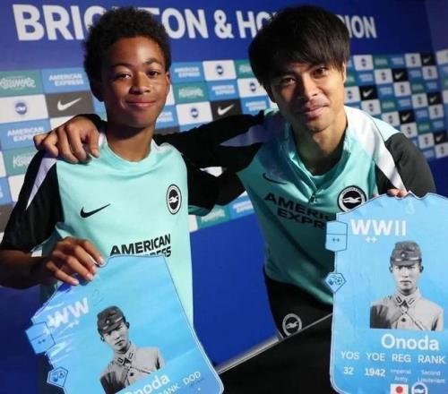 11月27日,布萊頓組織青訓學院參加英超休戰活動,三笘薰與一位日裔的黑人小球員一起合影。然而令人震驚并且憤怒的是,兩人舉著的卡片上赫然印著日本二戰戰犯小野田寬郎的照片!