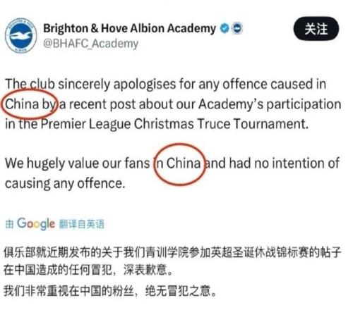 隨后,布萊頓俱樂部刪除照片并道歉:“針對近期發布的帖子在中國造成的任何冒犯,俱樂部深表歉意。我們非常重視中國的球迷,我們絕無冒犯之意。”