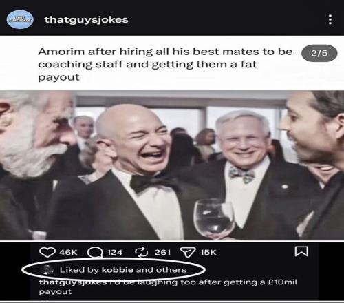 在曼聯解雇前任主帥魯本·阿莫林之后,20歲的英格蘭中場科比·梅諾在社媒點贊了一條嘲諷阿莫林貪財的帖子。該網文嘲諷阿莫林帶著自己的教練組到曼聯,然后主動造成被解雇,以便得到豐厚的補償。