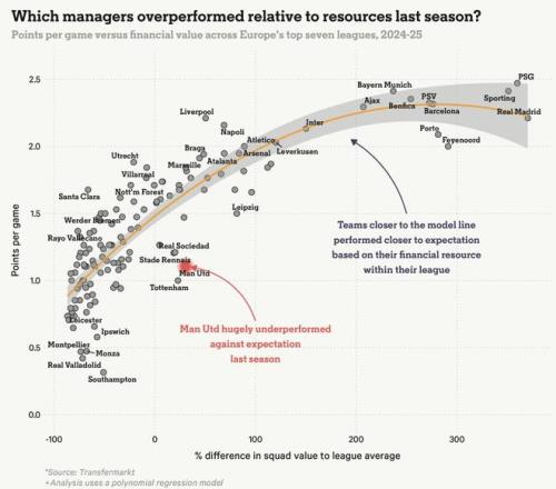 簡而言之,位于模型參考線之上的球隊,代表其主帥有效放大了陣容價值;而位于參考線之下的球隊——其中也包括曼聯——則體現出明顯的低于預期表現。