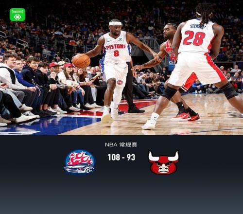 第四節活塞查茲-拉尼爾拿下8分,公牛武切維奇拿下5分,最終活塞108-93戰勝公牛