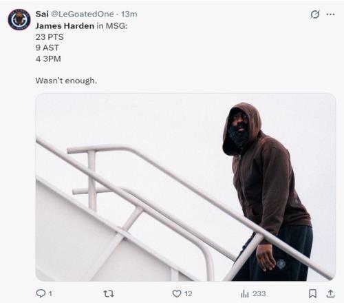 末節(jié),哈登、小卡兩個(gè)核心一同啞火了,兩人合計(jì)是7中1,只有哈登命中了一個(gè)運(yùn)動(dòng)戰(zhàn)進(jìn)球,末節(jié)兩人合計(jì)只有2分,哈登的命中率還更低一些,最終尼克斯完成了大逆轉(zhuǎn),哈登這場(chǎng)比賽肯定又要背鍋了。