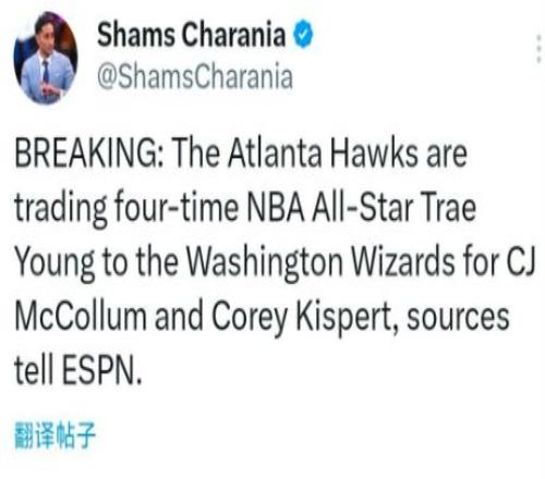 爆料王Shams:老鷹將特雷楊交易至奇才,換回CJ-麥科勒姆和科里-基斯珀特。