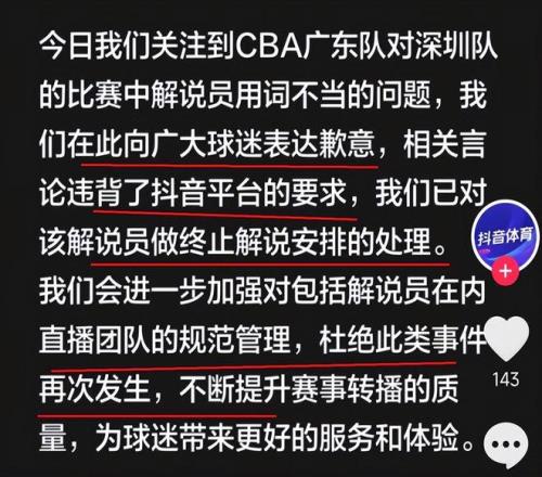 當(dāng)然抖音CBA平臺(tái)也及時(shí)進(jìn)行危機(jī)關(guān)公,昨晚深夜對這場比賽的解說員進(jìn)行了處理,并公開道歉,對當(dāng)事人做出終止解說的處理。以后宋庭再也沒有資格擔(dān)任抖音CBA的解說了。媒體人和球迷也對宋庭進(jìn)行了痛批。名記付政浩指出,媒體傳播學(xué)中有個(gè)媒體困境預(yù)言叫“娛樂至死”,預(yù)言未來的傳媒為了迎合大眾的娛樂訴求,社會(huì)公共話語表述必將由曾經(jīng)的理性和富有邏輯性變成膚淺、碎化,公眾表述盡可能娛樂化直到足夠低俗。他主張:體育解說員是需要專業(yè)門檻和專業(yè)培訓(xùn)的,一位合格的解說員,不僅要有體育專業(yè)知識(shí)儲(chǔ)備、精確的表達(dá)能力和一流的解構(gòu)能力,而且還要有職業(yè)敬畏感和文化差異的敏銳感知力,時(shí)刻繃緊多根弦,才能避免踩紅線。